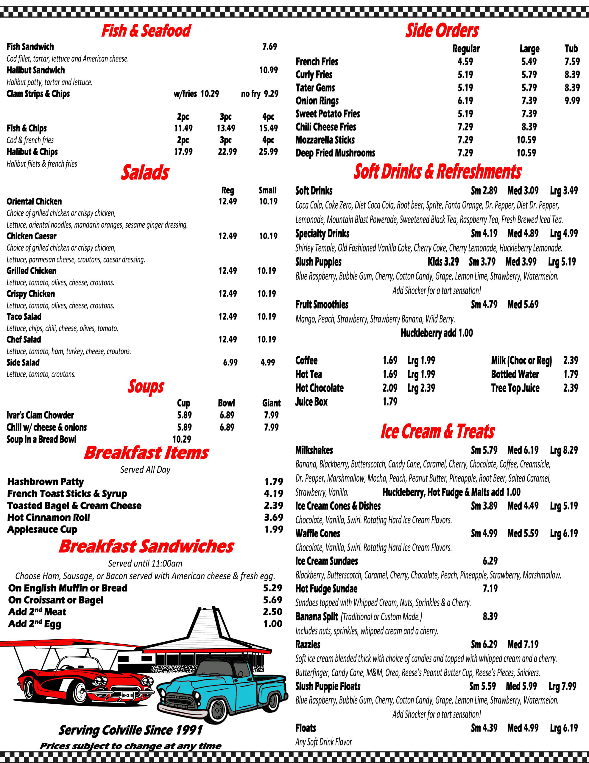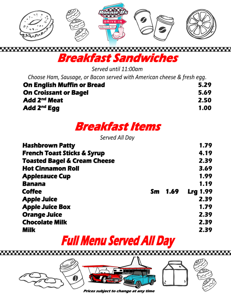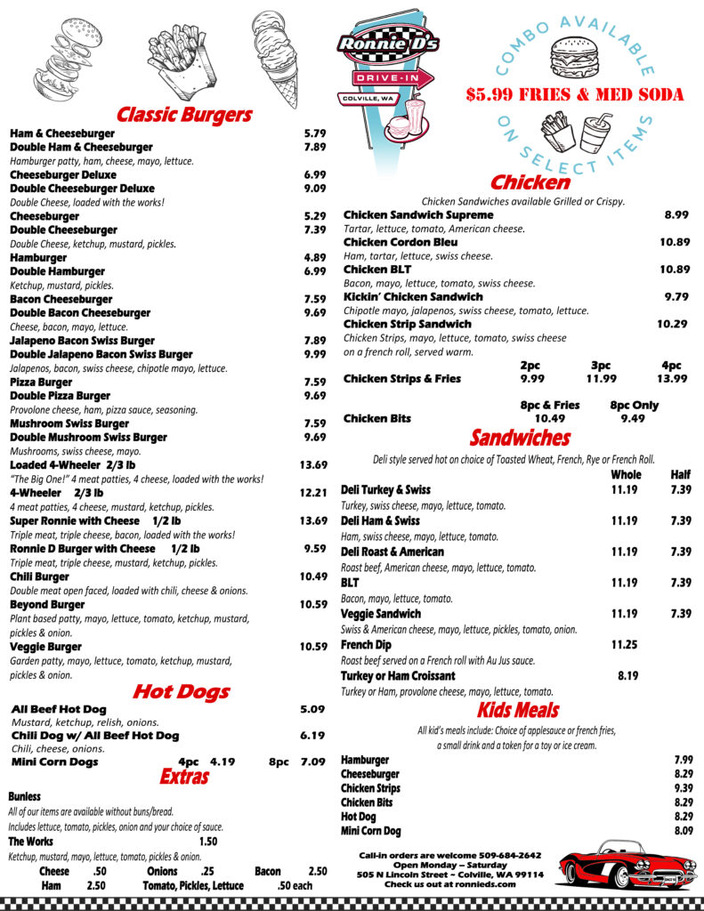 Ronnie D’s Drive In has proudly served the Colville community since 1991, offering delicious hamburgers, sandwiches, salads, milkshakes and many other classic fast food favorites.
